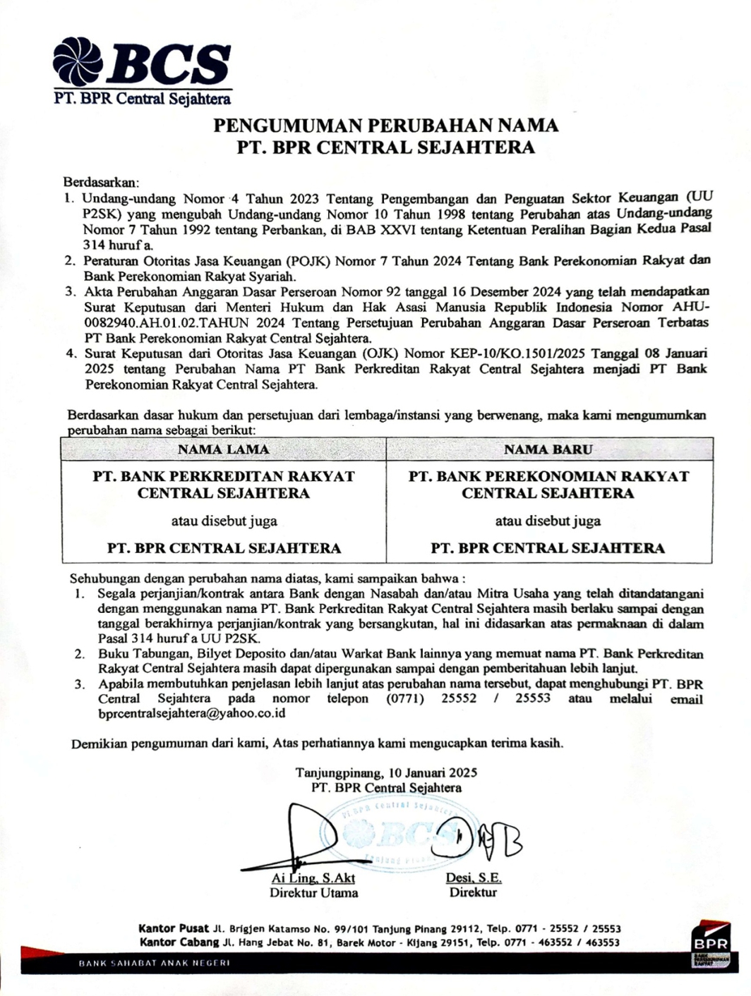 PT BPR Central Sejahtera merupakan peserta penjaminan LPS.