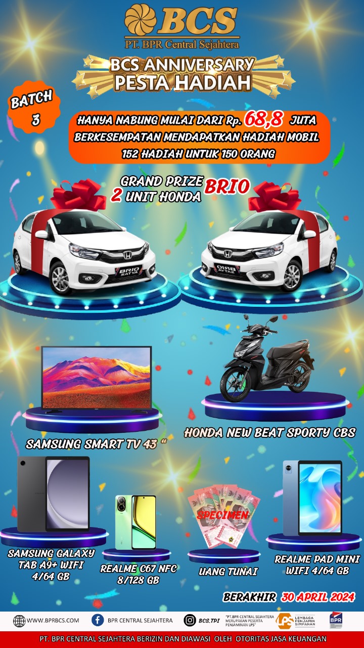 Oleh karena antusiasme dan permintaan yang cukup tinggi dari nasabah yang senantiasa menjadikan "BCS, Bank Pilihanku", BCS kembali menghadirkan program undian pesta hadiah batch ketiga yang jauh lebih menarik. Program batch ketiga ini akan diisi dengan 152 hadiah undian, dengan hadiah utama berupa dua unit mobil Honda Brio Satya E CVT, beberapa hadiah lainnya berupa Honda New Beat Sporty CBS, Samsung Smart TV 43", Samsung Galaxy Tab A9+ Wifi, Realme C67 NFC, Realme Pad Mini Wifi, dan hadiah tunai lainnya.