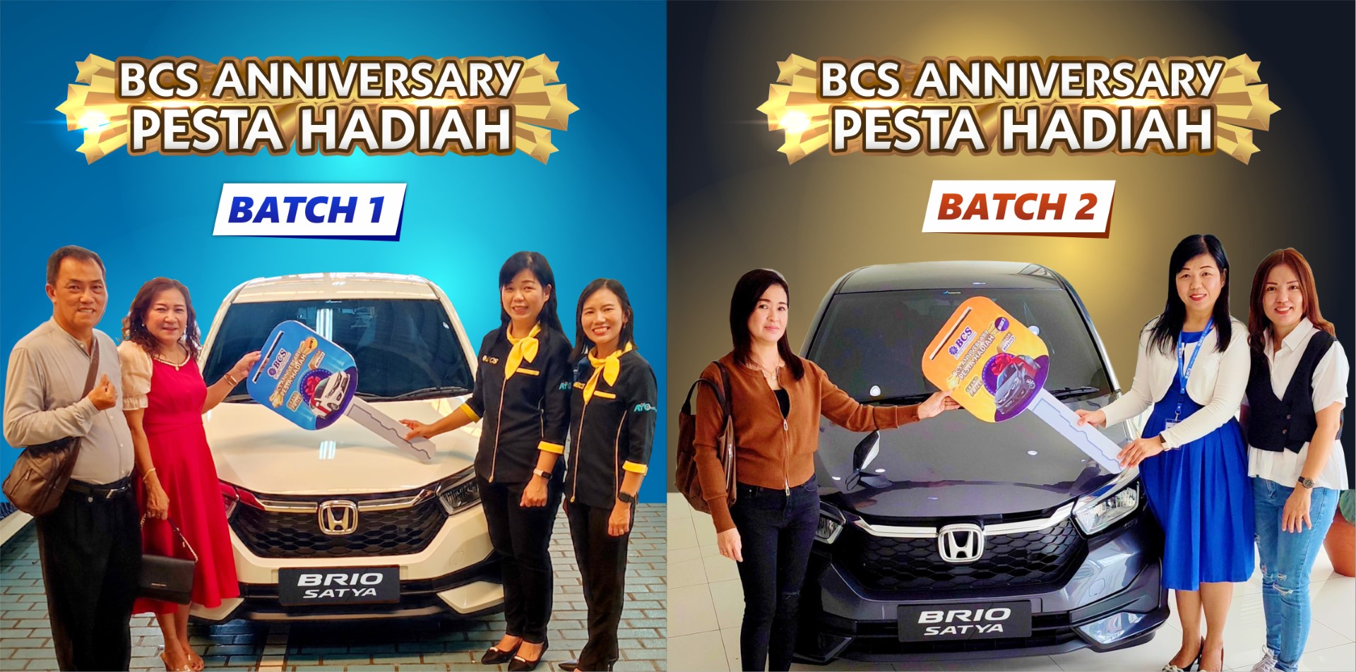 Pengundian hadiah utama berupa satu unit mobil Honda Brio Satya E CVT untuk batch pertama dilakukan oleh Pemegang Saham BCS, Kok Hwa, S.E. Hadiah utama tersebut berhasil dimenangkan oleh nomor undian BCS-1083, yaitu nasabah atas nama A Soi.