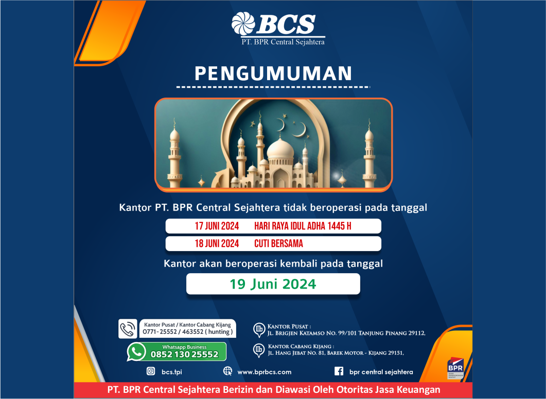 Direksi & Segenap Karyawan/ti PT BPR CENTRAL SEJAHTERA mengucapkan Selamat Hari Raya Idul Adha 1445 H