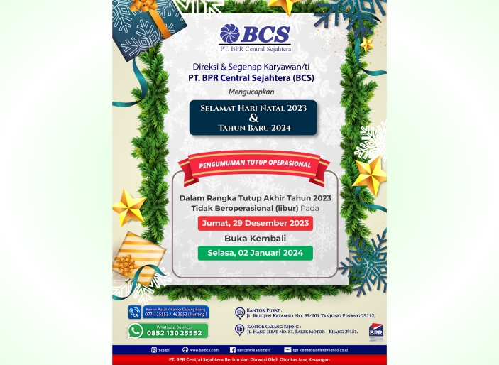 Direksi & Segenap Karyawan/ti PT BPR CENTRAL SEJAHTERA mengucapkan Selamat Hari Natal dan Tahun Baru
